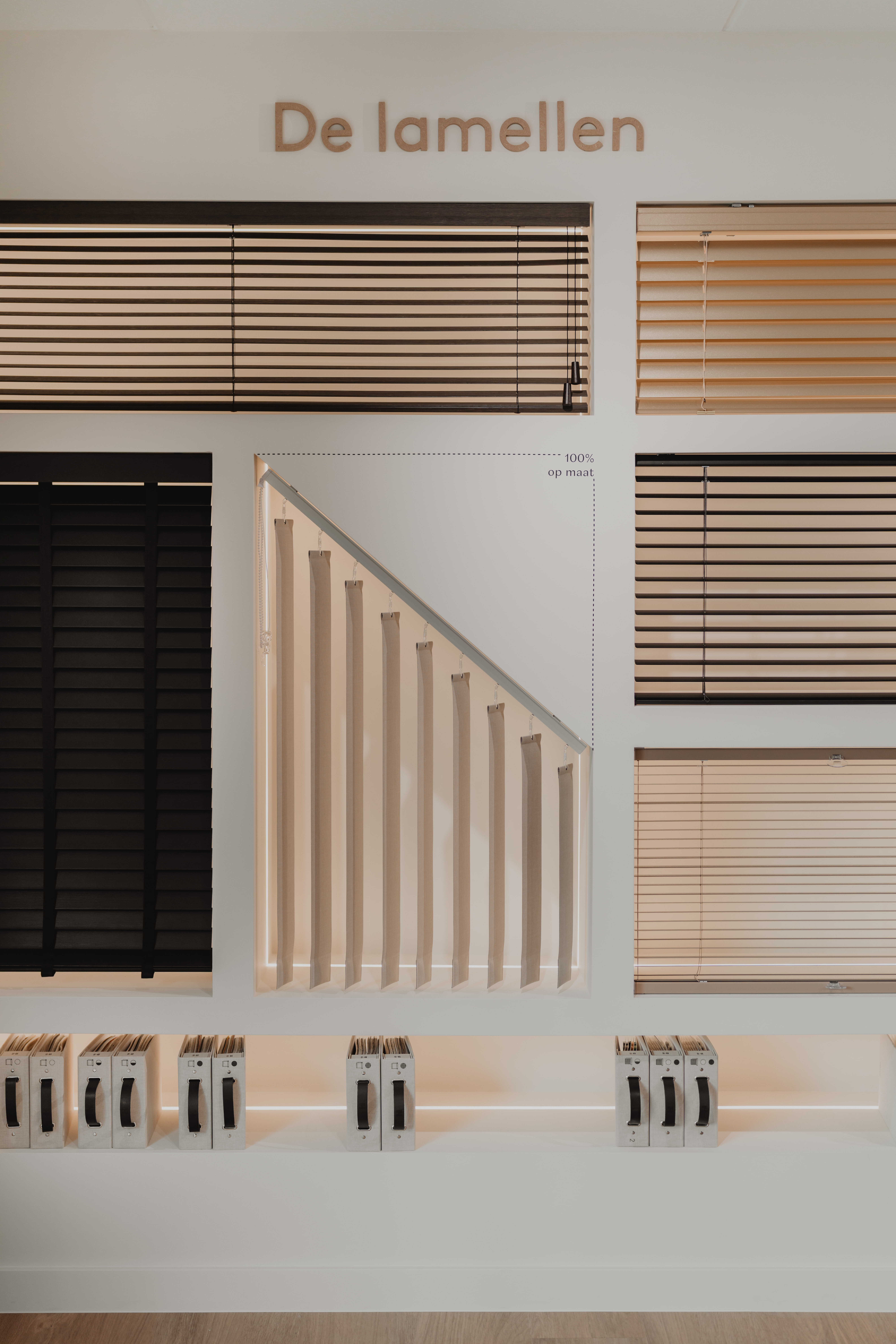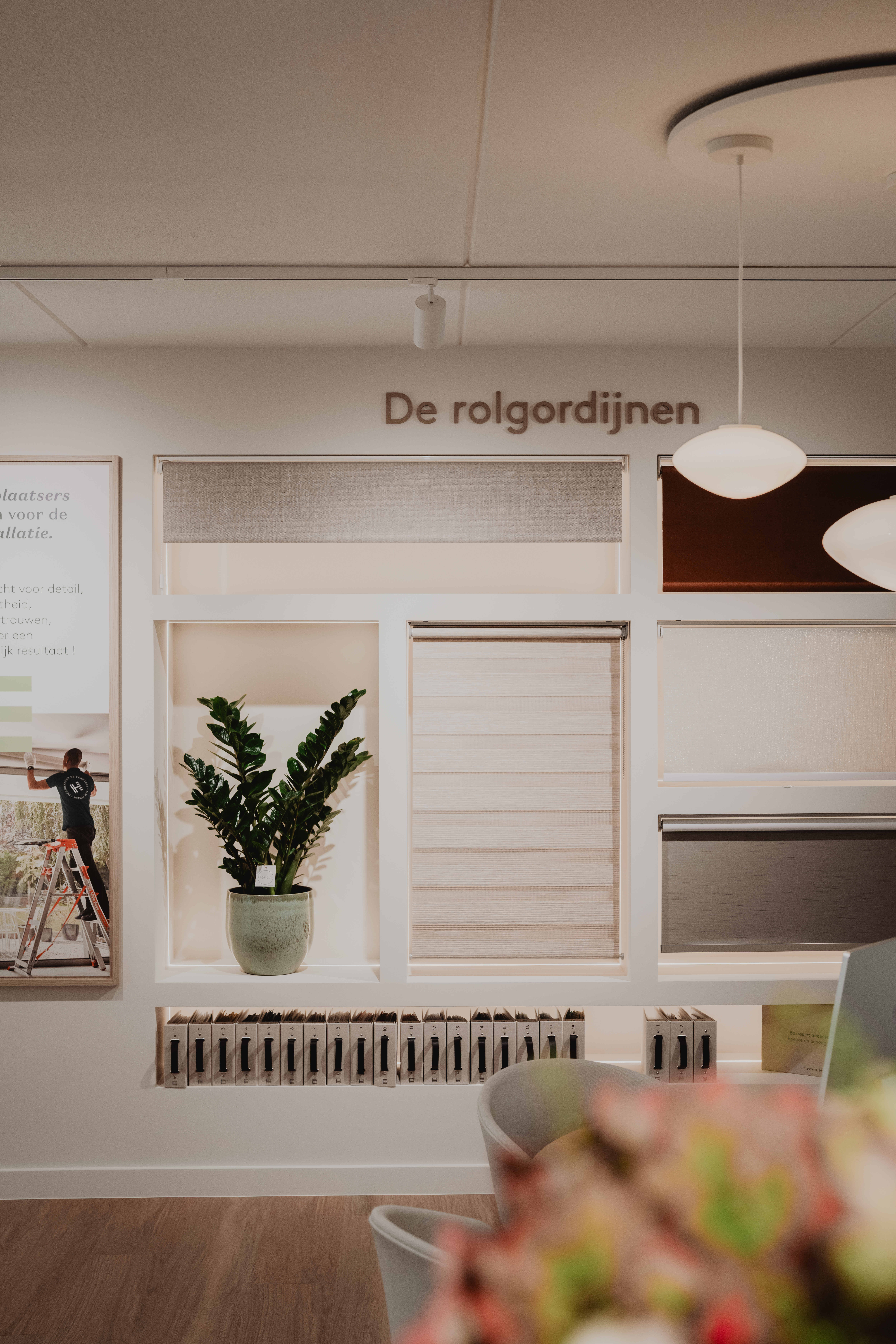 Le nouvel espace Heytens à Maldegem a été pensé pour recréer l’atmosphère d’une maison. Sa configuration chaleureuse et intimiste permet aux visiteurs de se projeter facilement dans leur futur intérieur. Les mises en scène, inspirées de salons réels, mettent en valeur l’étendue des collections : stores enrouleurs, screens, lames horizontales et verticales, stores plissés, voilages, rideaux ou panneaux japonais.